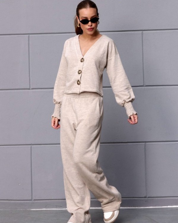 Set en tono beige compuesto por cardigan con botones y pantalón amplio que combina suavidad, estructura y estilo relajado.