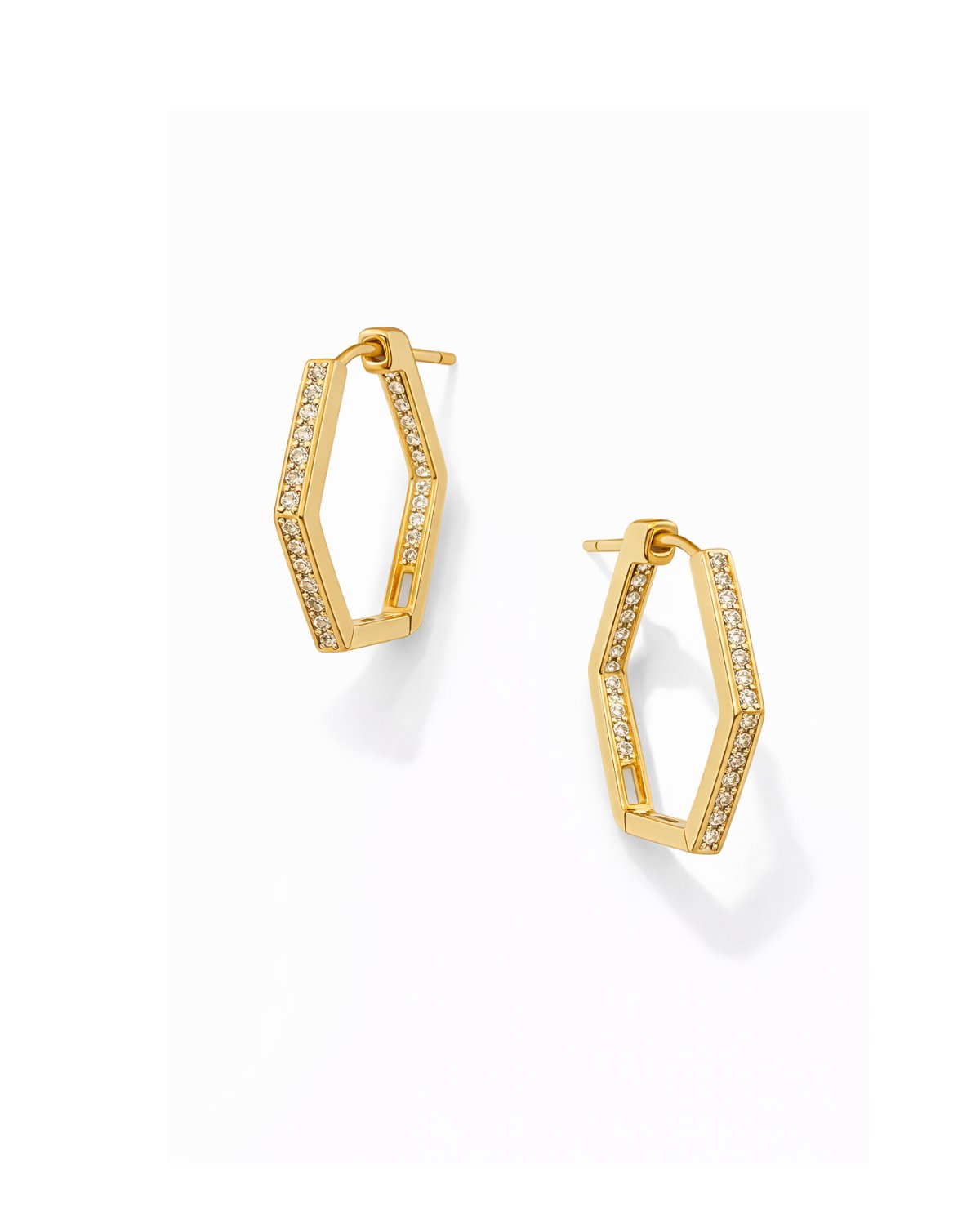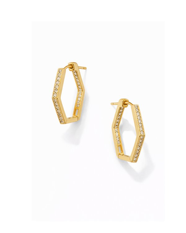 Argollas doradas en forma hexagonal con incrustaciones que aportan estructura, brillo y un look más moderno.