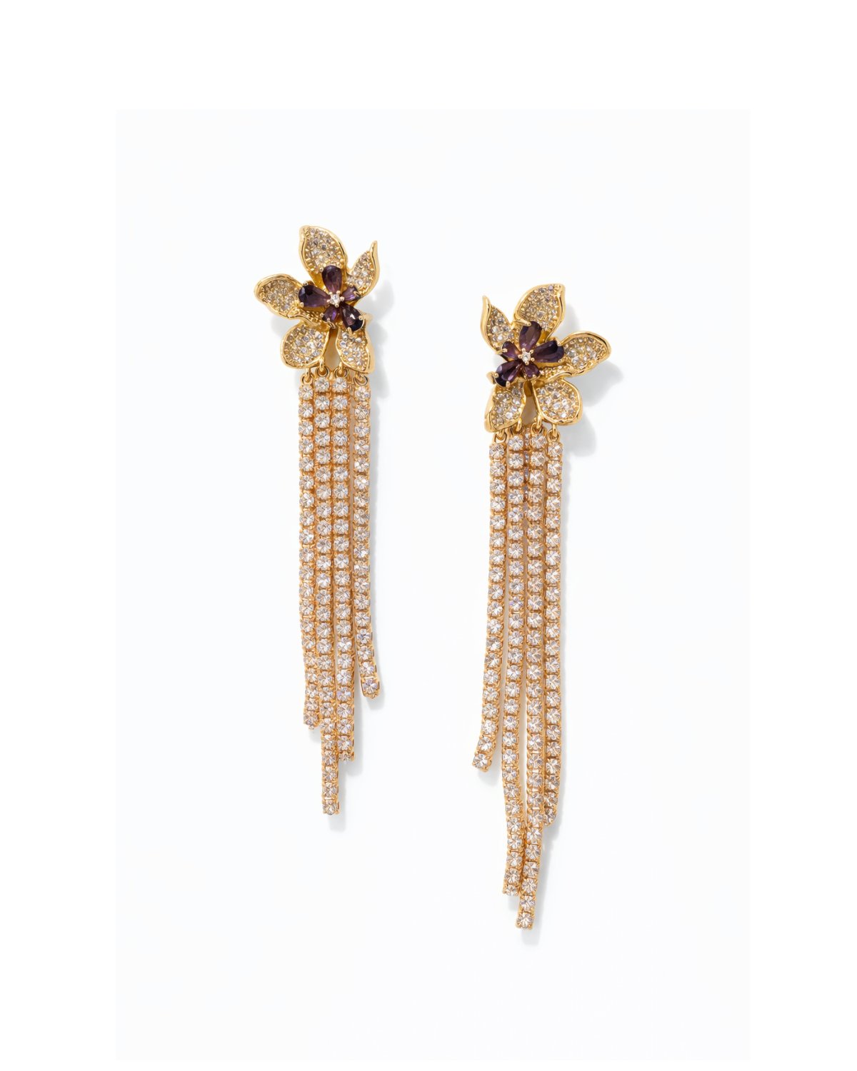 Aretes largos con diseño floral, cristales brillantes y caída tipo cascada que estiliza el rostro y eleva cualquier look.