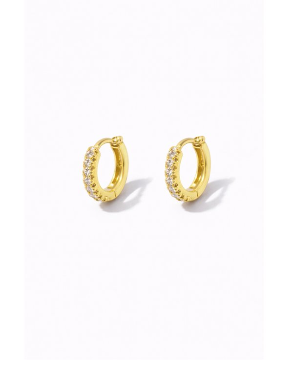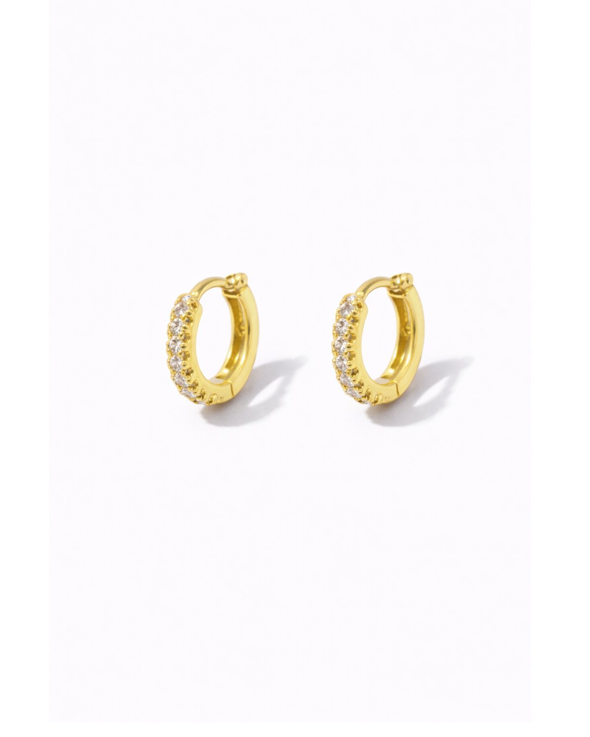 Aros pequeños en tono dorado con incrustaciones de brillo que aportan luz sutil al rostro.