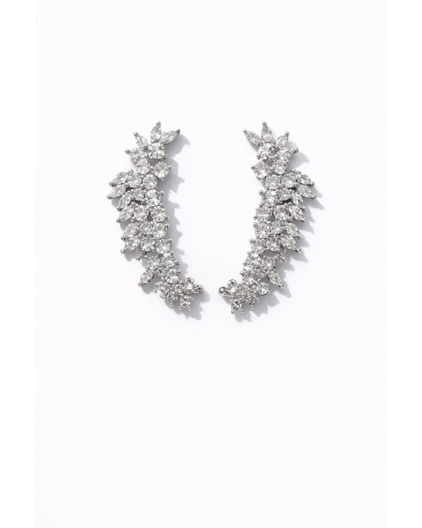 Aros largos con diseño tipo cascada de cristales que enmarcan la oreja y generan un efecto de brillo continuo.