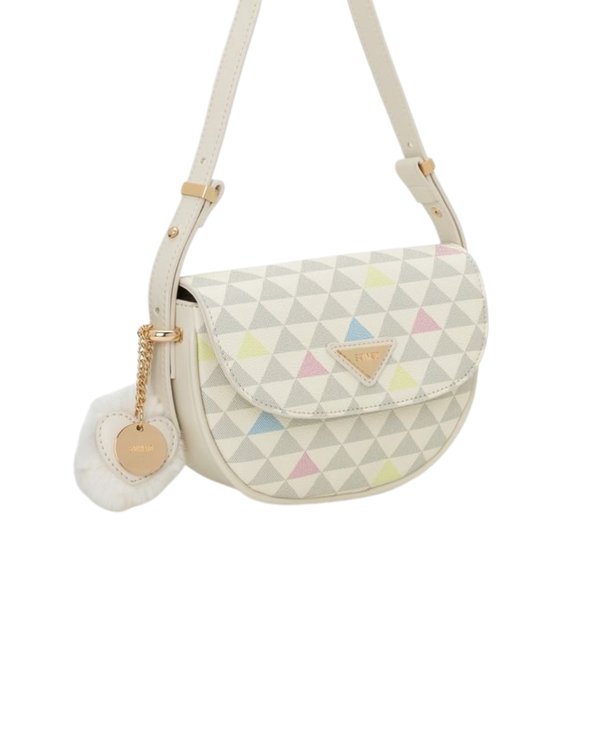 Mini cartera crossbody en tono claro con print geométrico en colores suaves y detalle decorativo colgante.