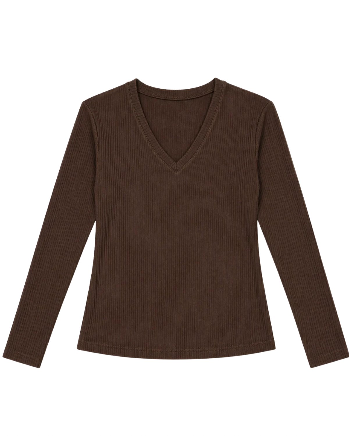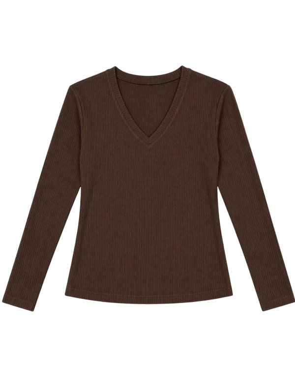 Top manga larga en tejido rib con escote en V, diseñado para estilizar y elevar cualquier look sin esfuerzo.